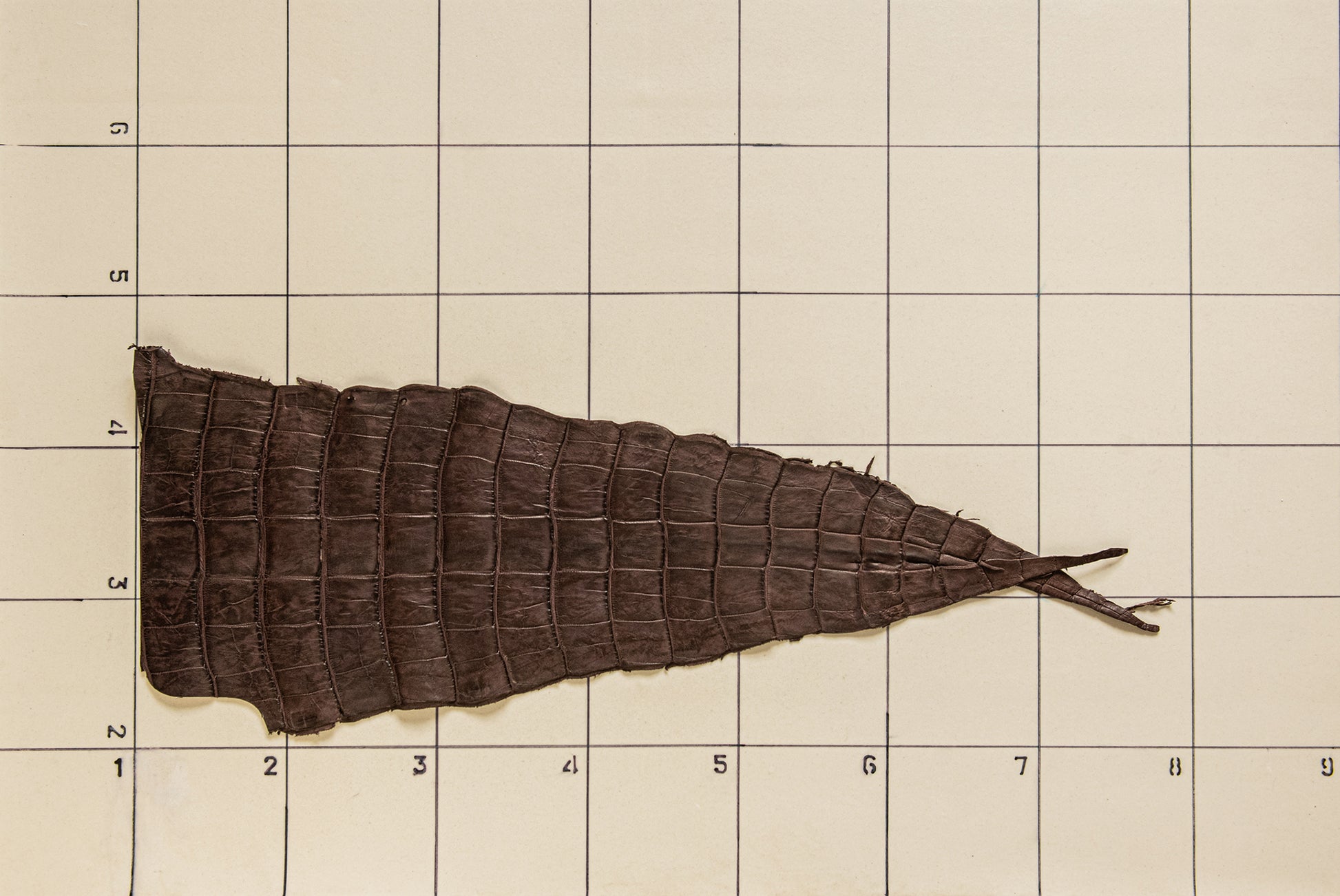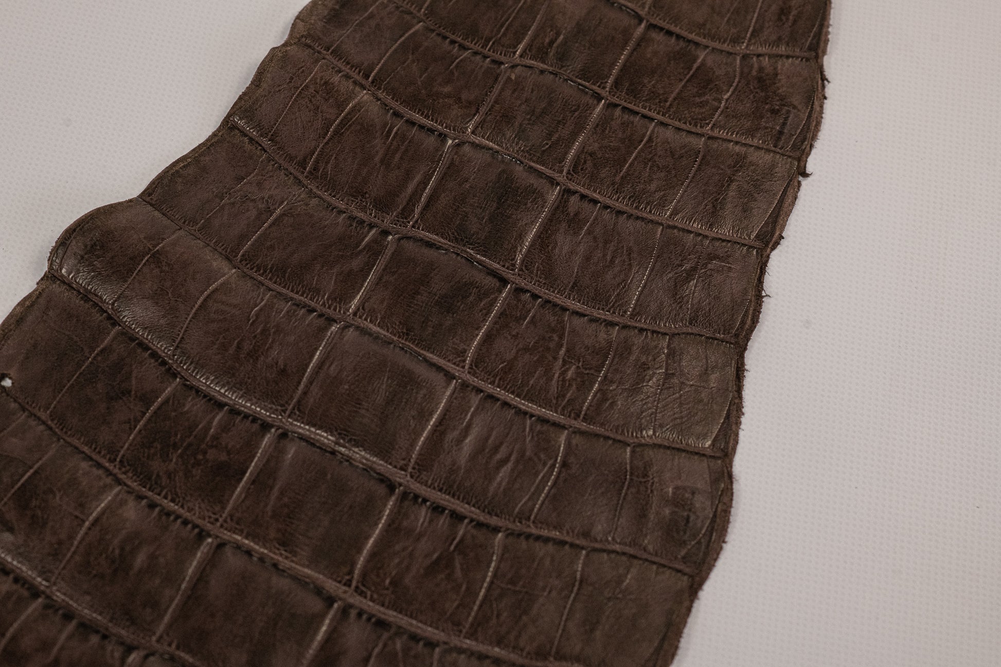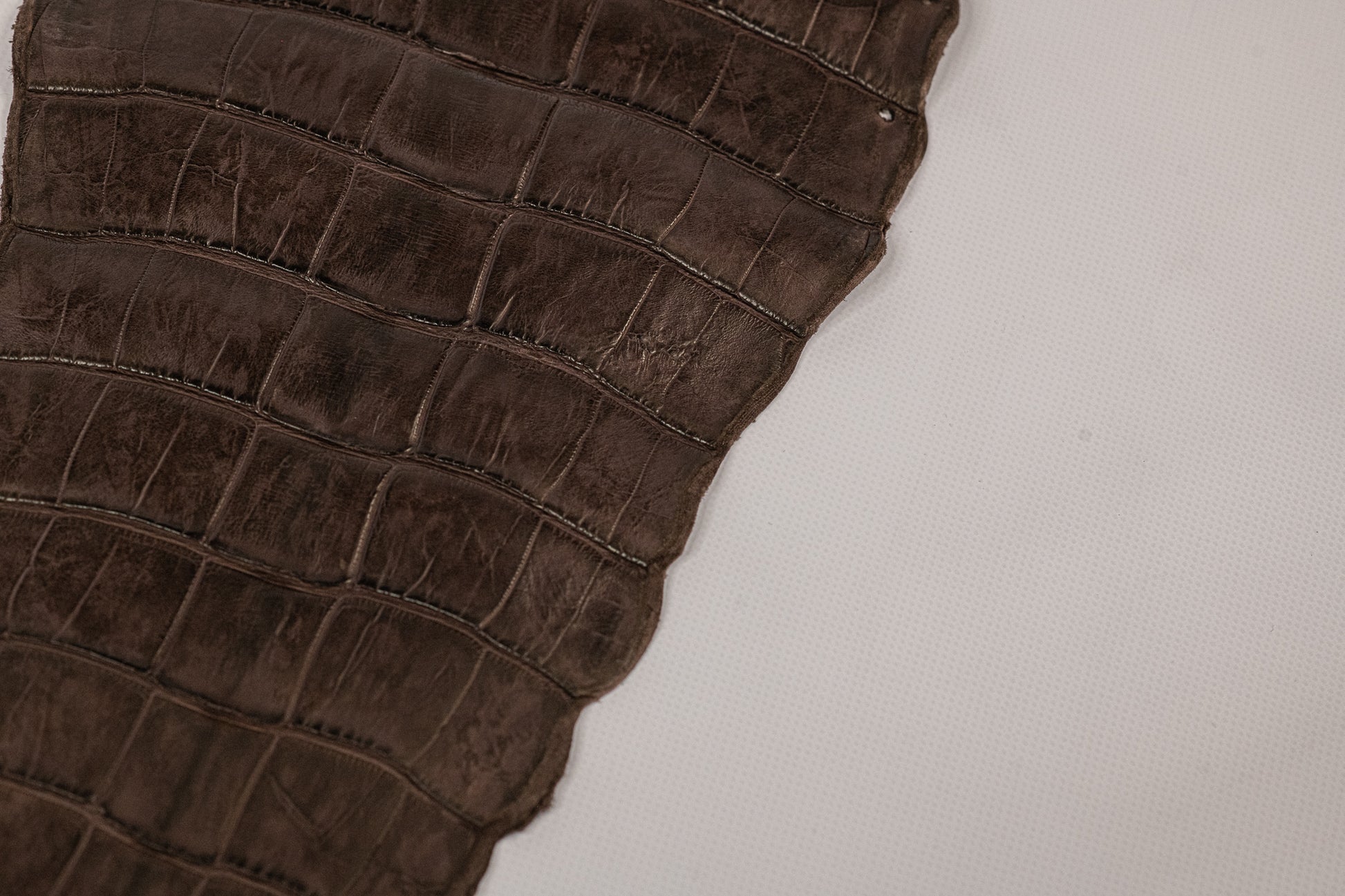 Alligator tail with huge scales. Nice finish with factory patina, has smooth and oily finish to touch. Not dry, medium soft. Excelent for brutal leather goods with a natural textured look. May be used for wallets, small bags and other small leather goods.